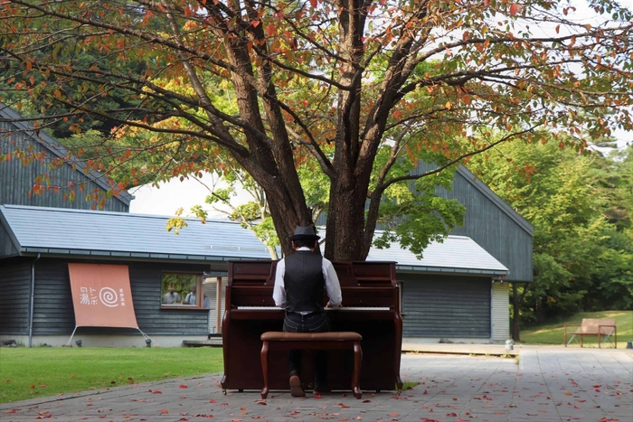 「軽井沢 森ピアノ」は、自然に囲まれた星野エリア内の広場で開催します。広場は日帰り温泉施設「星野温泉 トンボの湯」や、和食カジュアルダイニング「村民食堂」に隣接しており、屋外のベンチやカフェ席で、入浴後の待ち合わせをしたり、ティータイムを過ごしたりする人々の姿が見られるくつろぎの空間です。