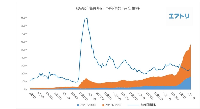 また、2019年のGWを10連休とする方針発表前後1週間の予約件数対比(※1)は853%と、長期連休の発表が海外旅行の需要喚起に繋がったことが伺えます。