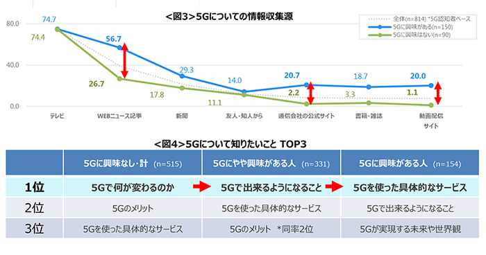 なお「5Gについて知りたいこと」についても聴取したところ、5Gに関心がない層では「5Gで何が変わるのか」→やや関心がある層では「5Gでできるようになること」→関心がある層では「5Gを使った具体的なサービス」といったテーマがTOPにあがった。<図4>