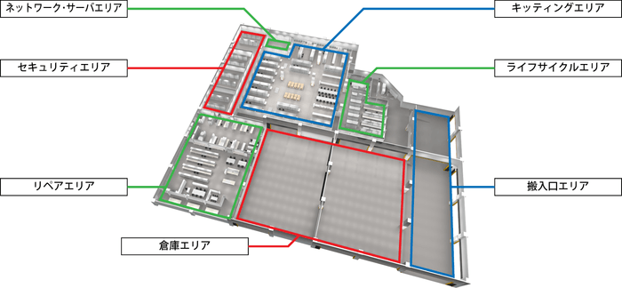 ・セキュリティエリアにはお客さま専用の独立したセキュリティルーム(4区画)を完備し機器の保管の他、マスター作成やキッティング作業もルーム内で実施