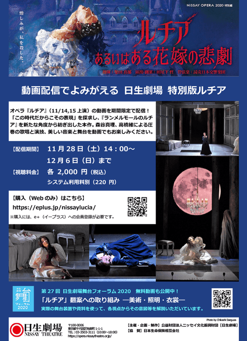 日生劇場にて、11 月 14 日(土)、15 日(日)に上演された NISSAY OPERA 2020 特別編 オペラ『ルチアあるいはある花嫁の悲劇』の動画を11月28日(土)~12月6日(日)の期間限定で好評配信中!動画視聴券発売中です。