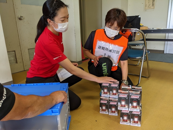 アルコールハンドジェル179本/大判タオル136枚/枕207個/ランタン16個と電池64個/扇風機10個/野菜・フルーツジュース300本 など(ランタンと扇風機は貸与)