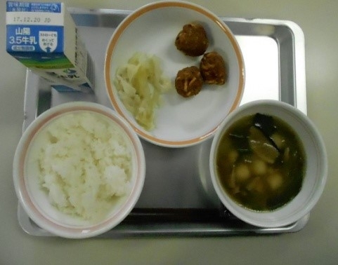 5.メニュー :ご飯、くわいの揚げ肉団子(福山大学学生開発メニュー)、ボイルキャベツ、白玉汁、牛乳