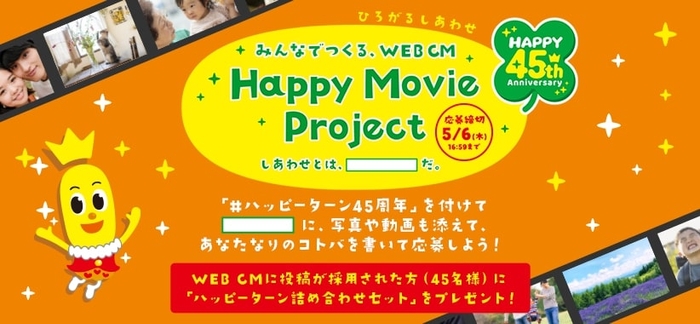 ハッピーターン45周年記念「みんなでつくる、WEB CM 『Happy Movie Project』」は、ハッピーターンの発売45周年を記念し、いまの時代にみんなが抱く“しあわせ”を集め(「しあわせとは、◯◯だ。」)、ひとつの動画を作り上げるSNS投稿キャンペーンです。