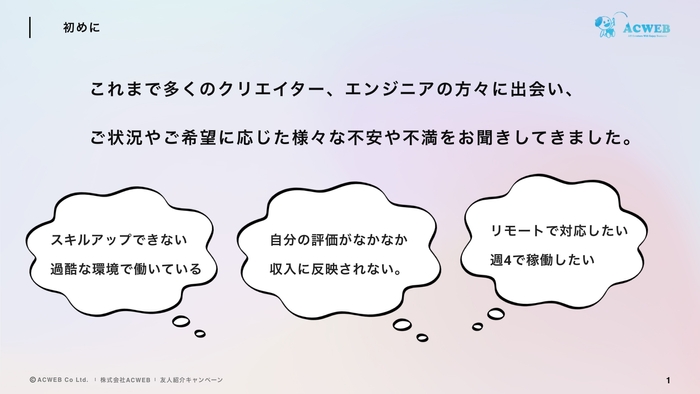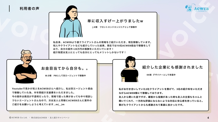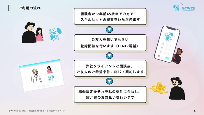 株式会社ACWEB(所在地:東京都品川区西五反田、以下ACWEB)が展開するアウトソーシング事業では、他者の方を紹介いただくと営業の支援費をお支払いする「友人紹介キャンペーン」を一般公開しております。