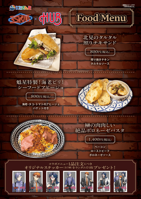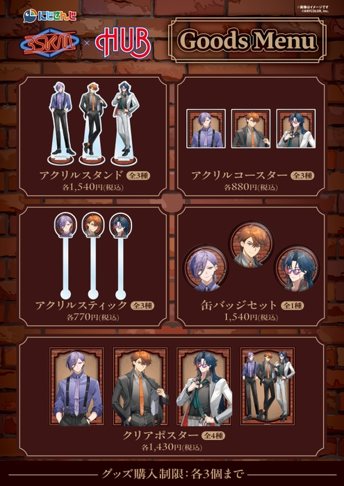 にじさんじ所属のVTuberユニット「3SKM(読み:スリーエスケーエム)」をイメージしたHUBオリジナルコラボメニューの販売、フォーマルな装いが魅力的な新規描き下ろしイラストを使用したライバーのサイン&一言メッセージ入り等身大パネルの展示・グッズ販売など、盛りだくさんの内容をお楽しみください。