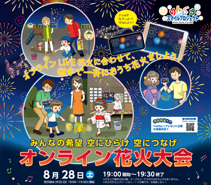公益社団法人 泉佐野青年会議所は、コロナ禍でも何か笑顔になれることはないかと泉佐野市の7団体によって構成された「りんくうスマイルプロジェクト」として、自宅や公園で楽しめる“オンライン花火大会”を2021年8月28日(土)19時より開催いたします。