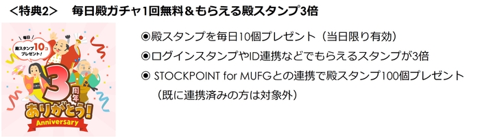 特典2:毎日殿ガチャ1回無料&もらえる殿スタンプ3倍