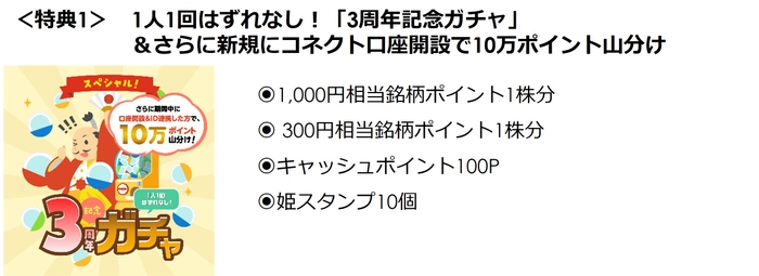 特典1:1人1回はずれなし!「3周年記念ガチャ」&さらに新規にコネクト口座開設で10万ポイント山分け