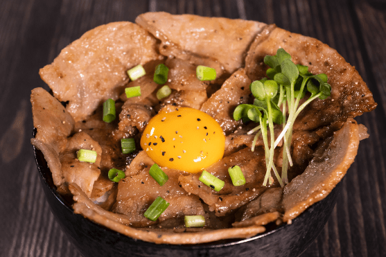 ② ごはんの上に、炒めた国産豚ロース味噌漬けを盛り付け、中央に卵黄を乗せる。