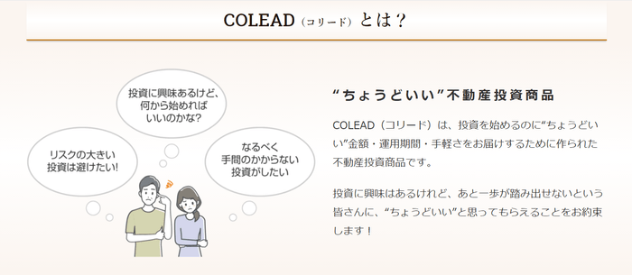 COLEADは1口50~100万円から出資可能とすることで、不動産投資の敷居を下げ、より多くの方に始めて頂きやすい不動産小口化商品を目指しました。