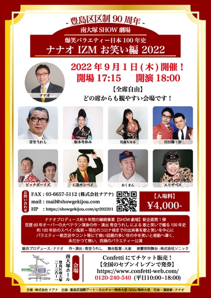 豊島区からエンタメを発信 笑いと歌のバラエティー公演 『南大塚SHOW劇場スペシャル ナナオIZM お笑い編』開催決定 カンフェティでチケット発売