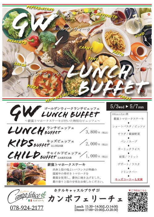 株式会社キャッスルホテル(本社:兵庫県明石市松の内2‐2、社長:成田良伸)は薪窯を使い、豪快に焼き上げた「トマホークステーキ」が付いたランチビュッフェを商品化しました。ゴールデンウイークの5月3日(水)~5月7日(日)の5日間、系列の西明石ホテルキャッスルプラザ(所在地:同)内にあるイタリアンレストラン「カンポフェリーチェ」で提供します。