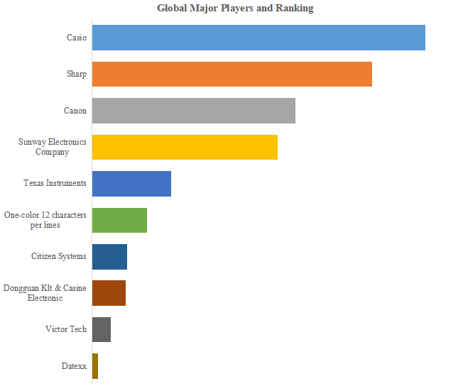 YHResearchのトップ企業研究センターによると、印刷用電卓の世界的な主要製造業者には、Casio、Sharp、Canon、Sunway Electronics Company、Texas Instrumentsなどが含まれている。2023年、世界のトップ3企業は売上の観点から約66.0%の市場シェアを持っていた。