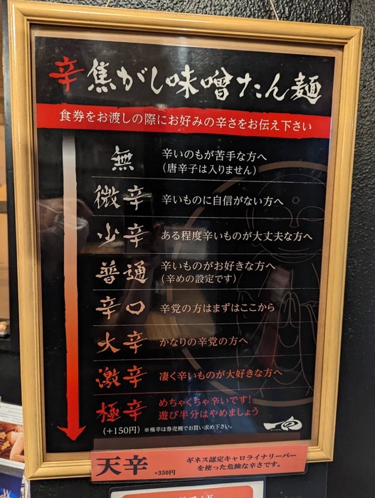 『辛焦がし味噌たん麺 一向』で定番の「辛焦がし味噌たん麺」は8段階で辛さが選べます。