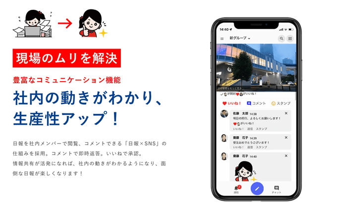 ・日報にいいね!やコメントが出来る「社内SNS」要素を搭載。