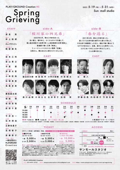 俳優・演出家の井上裕朗が代表を務めるPLAY/GROUND Creationの新作、PLAY/GROUND Creation #5『Spring Grieving』が2023年5月19日 (金) ~2023年5月31日 (水)にサンモールスタジオ(東京都新宿区新宿1丁目19-10 サンモール第3M-B1)にて上演されます。