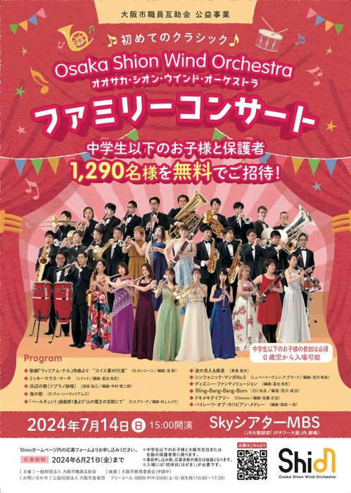 日本で最も長い歴史と伝統を誇る交響吹奏楽団「Osaka Shion Wind Orchestra(略称:Shion)」を有する公益社団法人大阪市音楽団(本社:大阪市住之江区/理事長:石井徹哉)の『初めてのクラシック🎵 Osaka Shion Wind Orchestra ファミリーコンサート』(2024年7月14日(日)、会場:SkyシアターMBS)に、1,290名様を無料でご招待します!