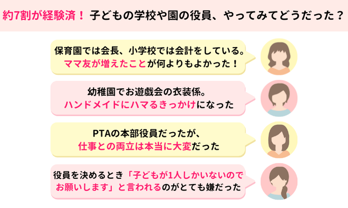 子どもをもつ親が関わるかもしれない、園や学校、地域、クラブなどでの役員や係。できれば避けたいという声がある一方、やってよかったという前向きな感想もあります。
