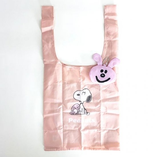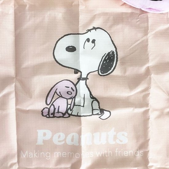 中央にキュートな表情のスヌーピーのイラストがあり、収納袋もついた便利なバッグ♪素材はリップストップ生地で、軽くて丈夫なので重い荷物を運ぶのにも活躍してくれます。