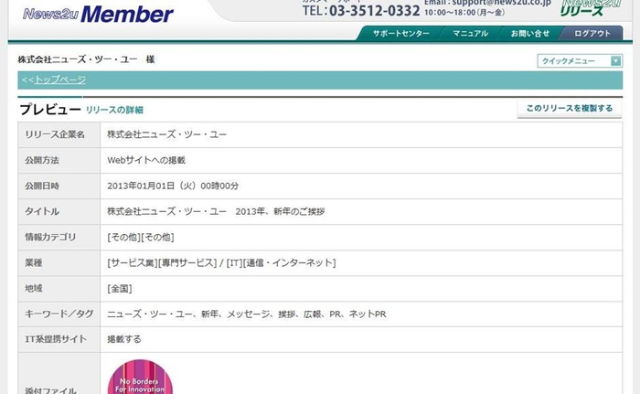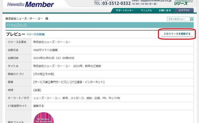 ネットPR事業を展開している株式会社ニューズ・ツー・ユー(東京都千代田区、代表取締役社長:神原弥生子)が運営する、ニュースリリース配信サービス「News2uリリース」では、2013年8月1日に、会員専用管理サイトの更なる利便性の向上を考慮し「リリース複製機能」を追加しました。