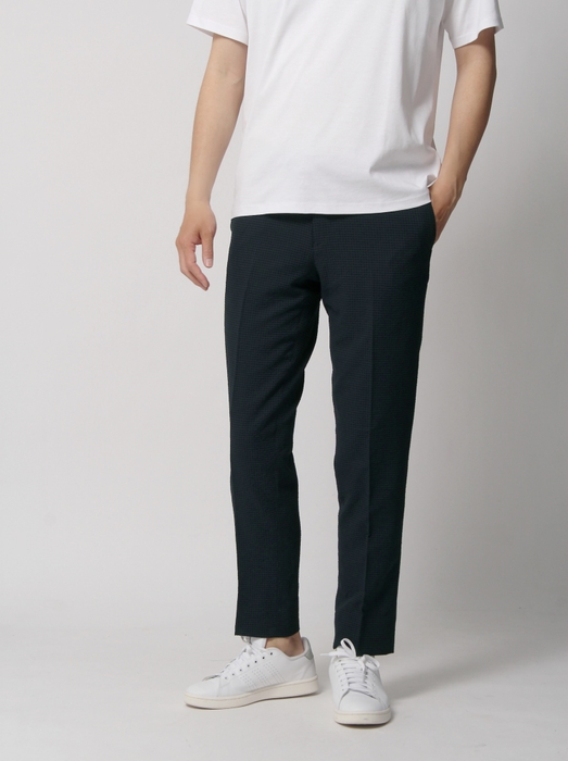 パンツデザインは、膝から裾にかけて細くなるテーパードシルエットでスッキリと見えるフィットモデルを採用しています。色柄は、ビジネスでも使いやすいネイビー、グレーを中心に織柄と無地の計6種類を取り揃えています。