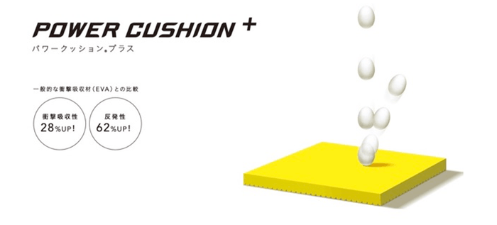 衝撃吸収性と反発性を併せ持つ「軽く、疲れにくい」衝撃吸収反発素材パワークッション。パワークッションに反発性の高い特殊樹脂を添加し、+型の溝を最適な間隔と深さで格子状に配置した新構造を採用した「パワークッション®️プラス」は、従来の軽量性を保ちつつ、衝撃吸収性を28%※1、反発性を62%※2アップさせ(一般的な衝撃吸収材[EVA]との比較)、12mの高さから落とした生卵が、割れずに6m以上跳ね返る※3衝撃吸収反発素材です。