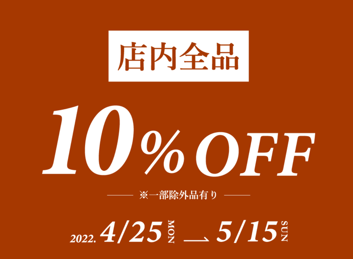 期間中、店内の商品が全品10%OFFでご購入頂けます。