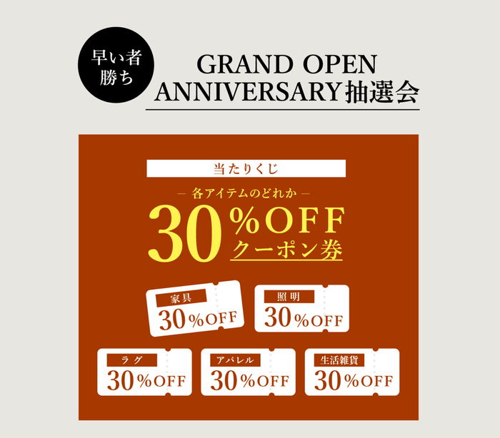 ※抽選の当たりくじ30%OFFクーポン券は、それぞれのクーポンに該当するカテゴリーの商品にお使いいただけます。