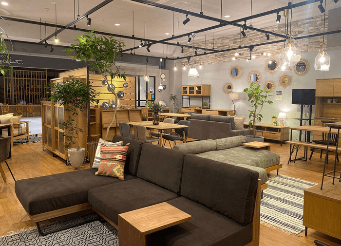 店内には天然素材の良さ活かしたダイニングテーブルや、ソファなどの家具はもちろん、