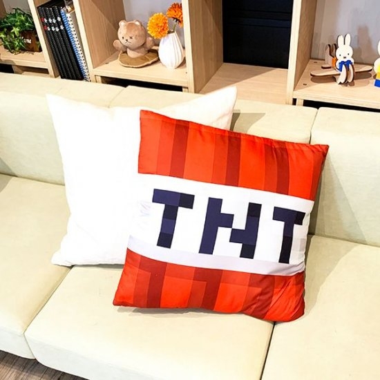 TNT火薬のクッションもありました!こちらは四角い背当てクッションとなっていてソファやイスに置いて背中をリラックスしてくれます。TNTが背中にあると思うとリラックスしにくいという方はインテリアにどうぞ♪あなたのマインクラフトコレクションに加えてあげてください!