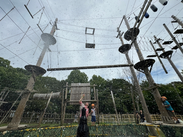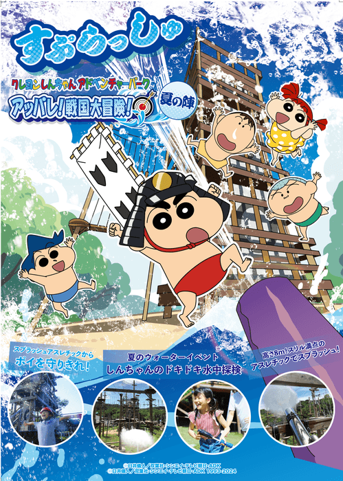 兵庫県立淡路島公園アニメパーク「ニジゲンノモリ」の大人気アトラクション「クレヨンしんちゃんアドベンチャーパーク」では、高さの異なる4つのコースを楽しめるアスレチック「アッパレ!戦国大冒険!」にて、エリア全体で水しぶきが飛び交う中、ヘルメットにつけた“ポイ”を濡らさずにアスレチックを攻略するウォーターイベント『スプラッシュアスレチックからポイを守りきれ!』を本日7月1日(月)から9月1日(日)までの期間限定で開催いたします。