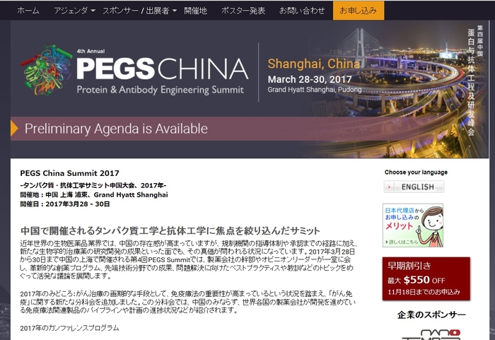 株式会社グローバル インフォメーションでは、皆様の利便性を図る為に、日本語、英語、韓国語、中国語で「PEGS China Summit 2017-タンパク質・抗体工学サミット中国大会 2017年」の情報を提供するとともに、学会の参加のお申し込みを承っております。