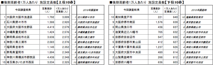 ~ビッグデータで見る 「全国970市区部 高齢者1万人あたりの施設定員数」~ 上位の大阪市浪速区、石川県野々市市は3年前と変わらず 下位10市区は大きく変動し、最下位は京都府八幡市