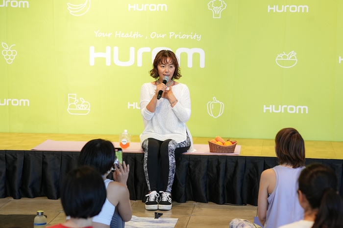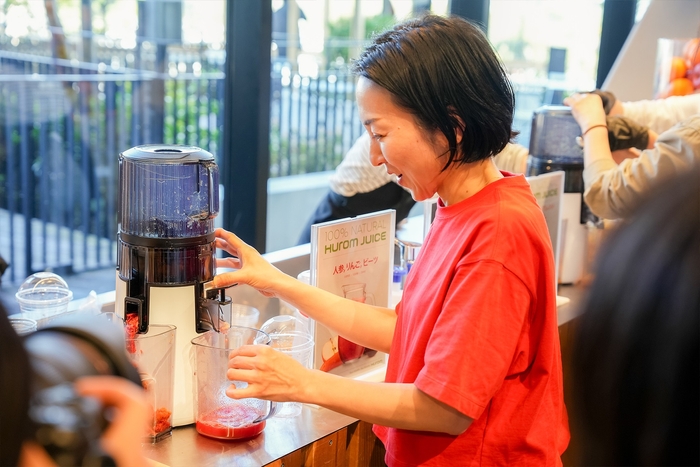 「H70FT」の詳細が初公開され、ヒューロムグローバルアンバサダー田中律子さんが登壇。ジュースを飲むだけでなく、日々のライフスタイルにどのように取り入れることができるか、田中さん自身の体験談を交えて紹介されました。また、田中さんがオススメするコールドプレスジュースのレシピが実際に「H70FT」で作られ、参加者にはその搾りたてジュースも提供され、最新機種の魅力を体感しました。