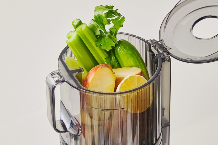 材料の準備過程を減らし、より便利に。カットしていない材料を一気に入れても自動でカットし搾汁します。メガホッパーに材料を詰めてスイッチを押すだけで、健康的なジュースの完成です。