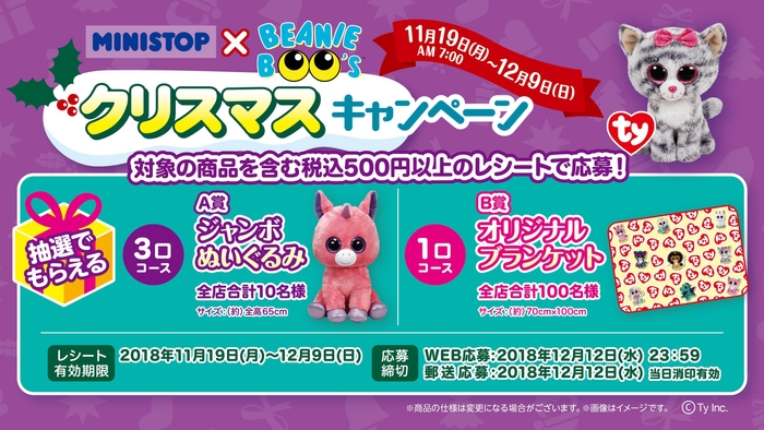 ミニストップ株式会社(本社:千葉県千葉市 代表取締役社長:藤本 明裕、以下:ミニストップ)は、「ビーニーブーズ」とタイアップしたクリスマスキャンペーンを、2018年11月19日(月) 7:00より、国内のミニストップ(2018年10月末現在:2,225店)にて実施します。