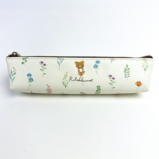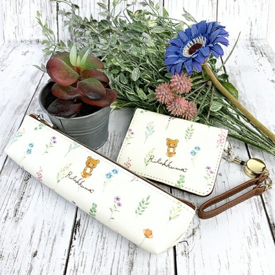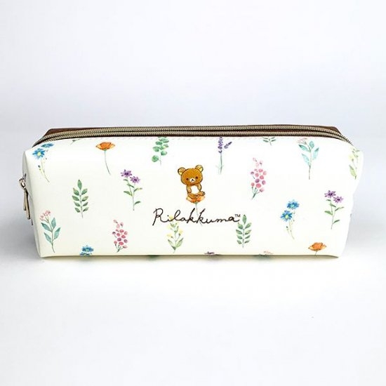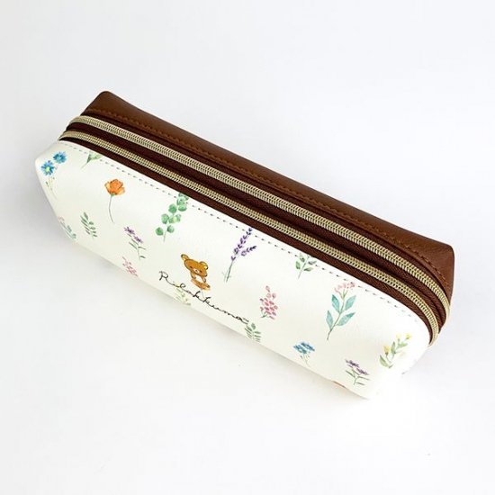 ホワイトの背景に、リラックマのデザインがキュートなペンポーチです。周りには草花が描かれていて、人気のボタニカルテイストなデザイン♡