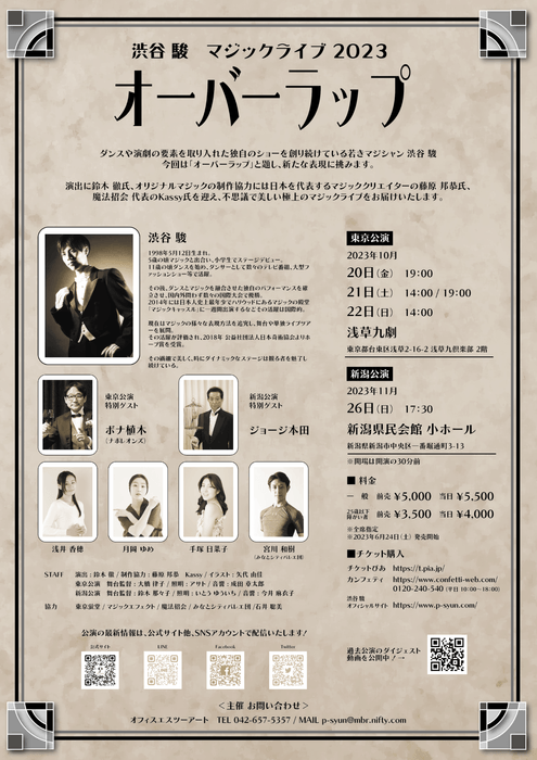 オフィスエスツーアート主催、渋谷 駿 マジックライブ 2023『オーバーラップ』が下記の通り上演されます。