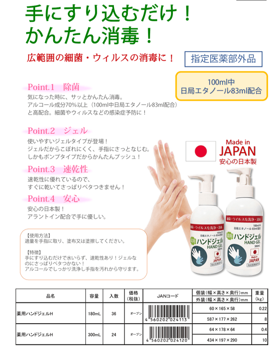 安心の日本製,日局エタノール83%配合の薬用ハンドジェル(指定医薬品外品)販売開始のお知らせ!
