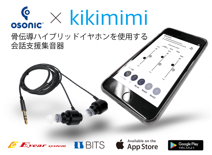アイアシステムのOSONIC[オーソニック](軽・中度難聴者向けハイブリッド骨伝導イヤホン)と、ビッツのスマホアプリkikimimi[キキミミ]は、お手持ちのスマートフォンで補聴器並みの性能を実現。さらに高価な集音器以上の機能をもたせました。