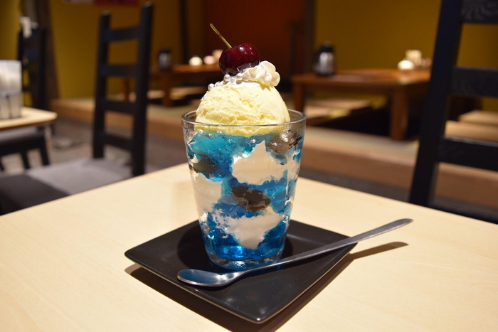 ブルーゼリーにコーヒーゼリーとバニラアイスが加わった爽やかな一品【坂田 銀牙(さかたぎんが)】を580円(税抜)にて発売。