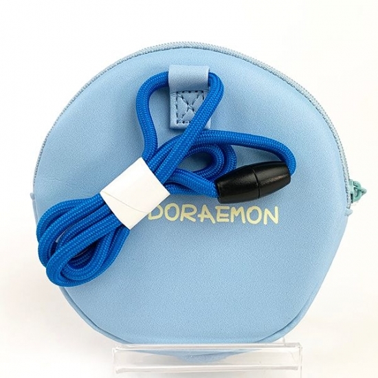 裏側には、ドラえもんのロゴが入っていて、首や肩にかけられるストラップもついているのでポシェットにもなります。取り外しも簡単なので、便利ですよ。
