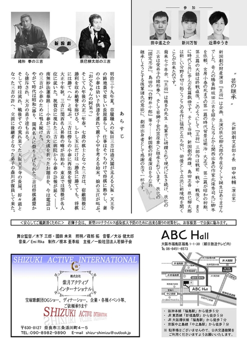 演劇史の1ページに残る新国劇の名作、北條秀司 作・演出に拠る「王将」を、笠原章 演出・主演で、数多くの名場面・辰巳柳太郎師の芸風を踏襲しつつ、新たな工夫で割愛しての一挙上演。