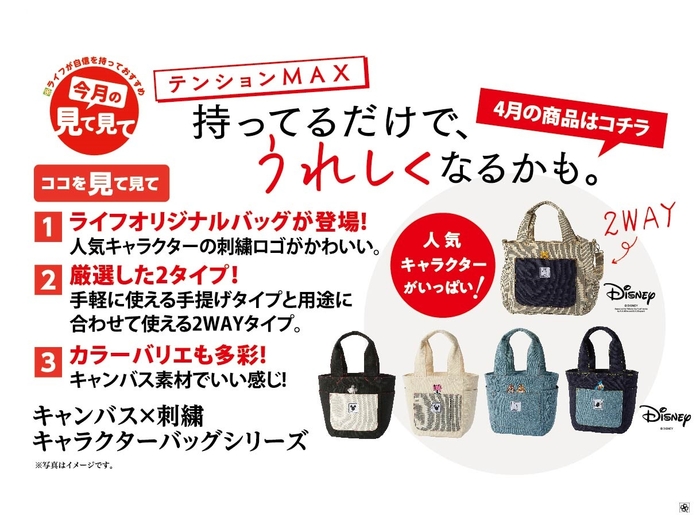 ライフが自信を持っておすすめする「今月の見て見て」の近畿圏4月商品に選ばれた「キャンバス×刺繍 ディズニーキャラクターバッグシリーズ」は、ディズニーの人気キャラクターの刺繍が施されたライフオリジナルバッグです。5種類の