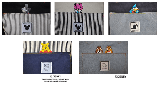 ミッキーマウス・ミニーマウス・ドナルドダック・くまのプーさん・チップ&デールを高級感のある刺繍であしらっています。