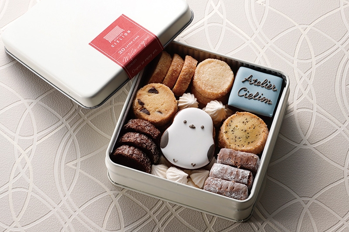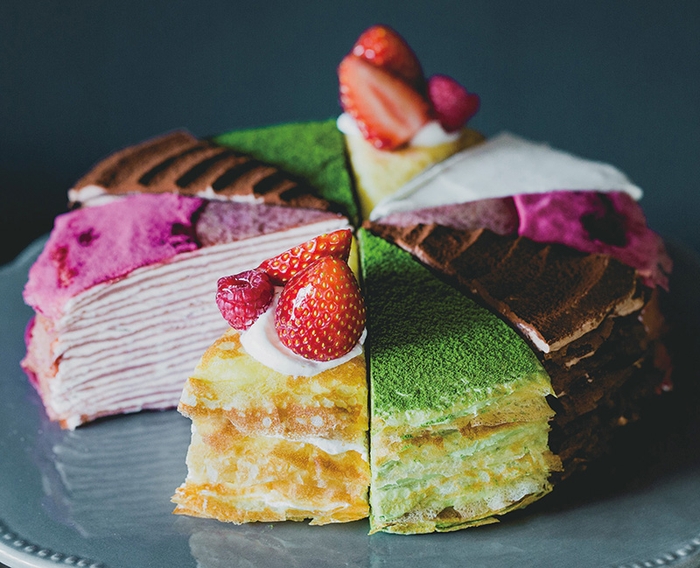 北海道産小麦の生地とクリームを1枚1枚丁寧に重ね合わせたアートなミルクレープは実演でお楽しみいただけます。かわいいクッキー缶も販売。