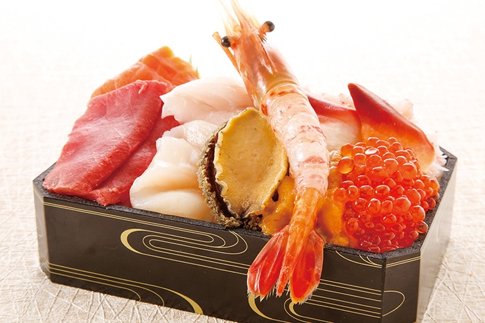ぼたん海老、うに、いくら、あわびなど人気のネタばかりをのせた豪華な海鮮弁当を実演で。