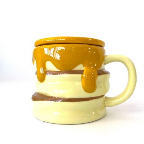 最後はこれまたインパクトのあるマグカップです。ふわふわのホットケーキがマグカップになっちゃいました!とろーりと垂れるはちみつがなんとも美味しそうですよね~♪フタ部分にはバターが乗っていて、ジョージも描かれています。