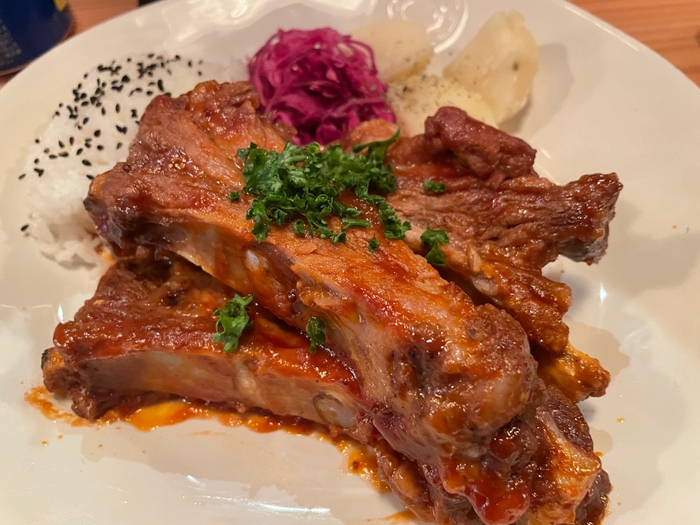 当店の国産スペアリブは自家製バーベキューソースにじっくり漬け込まれ、とても柔らかく仕上がっています。お腹いっぱいになるように、3本のランチセットを1500円でご提供しております。料理長は新潟出身で、30年間にわたる秘伝のレシピで作られたスペアリブには、ご飯が進むこと間違いありません。